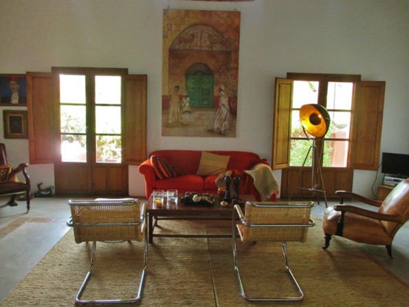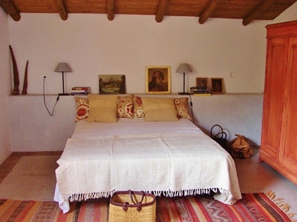 The cortijo sleeps six people in three bedrooms. It has been renovated with great care using traditional materials - the windows, shutters and doors all made by a local carpenter with seasoned chestnut wood. There’s a double height sitting room full of books, DVD’s, comfy seating and doors to the porch and terrace. It’s airy and cool in summer; warm and atmospheric in winter. The kitchen is well equipped and has an old stone work table. There is a huge dining table which gives access to the back terrace. The three bedrooms are all ensuite, individually decorated and furnished with rugs and textiles from Morocco and Mali. The upstairs double has access to a secluded roof terrace with mountain views. Two twin bedrooms lead onto the covered porch through french windows with lovely countryside view.