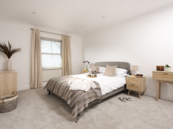 Situated on the first floor with its own en-suite shower room, this bedroom has a walk-in wardrobe and is furnished with a king size bed, bedside tables and lamps, chest of drawers and a smart TV