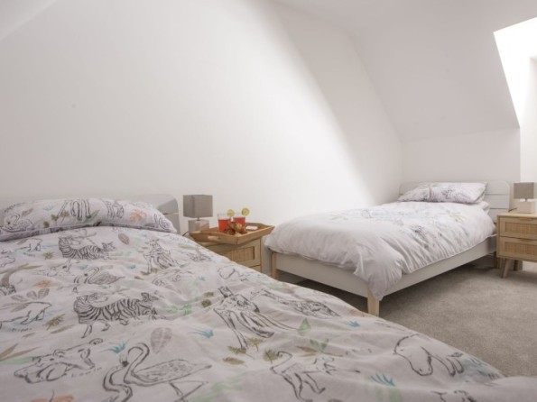 Situated upstairs on the second floor this bedroom is furnished with twin beds, bedside tables, lamps, chest of drawers, a mirror and a freestanding wardrobe