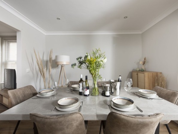 Situated on the ground floor and open plan with the living room, the dining room has a large table with seating for ten. Glass doors access the enclosed garden