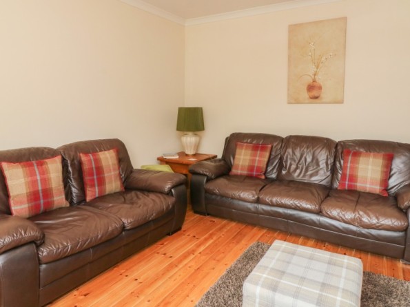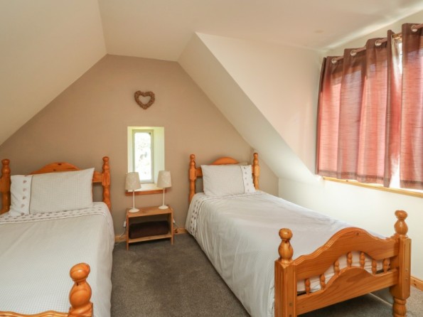 Two bedrooms: 1 x double, 1 x twin. Ground floor bathroom with bath, shower cubicle, basin & WC. Fitted kitchen with dining area & patio doors to decked area. Sitting room with woodburner.
