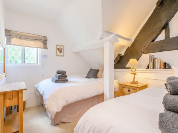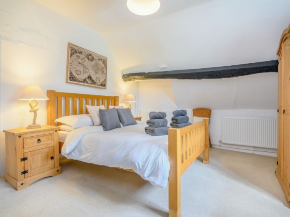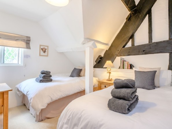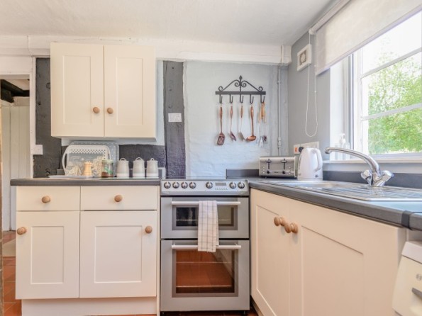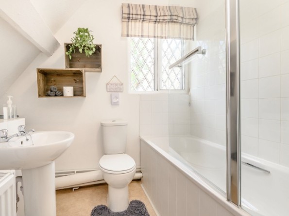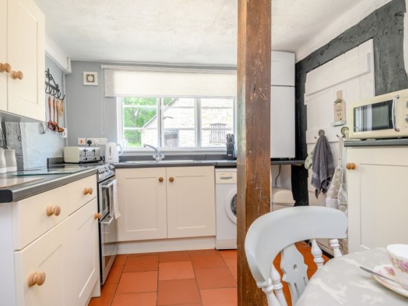 Two bedrooms: 1 x king-size double, 1 x twin. Bathroom with shower over the bath, basin and WC. Ground floor basin and WC. Kitchen with dining area. Sitting room with electric woodburner-effect stove.