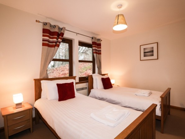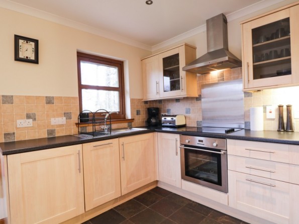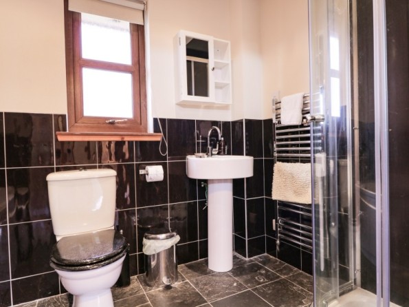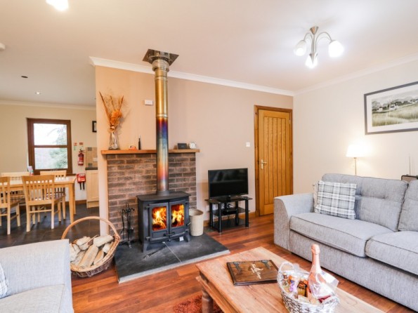 All-ground-floor. Two bedrooms: 1 x king-size, 1 x twin. Bathroom with Jacuzzi bath, separate walk-in shower, basin, heated towel rail and WC. Open-plan living area with kitchen, dining and sitting area with woodburning stove with log starter pack