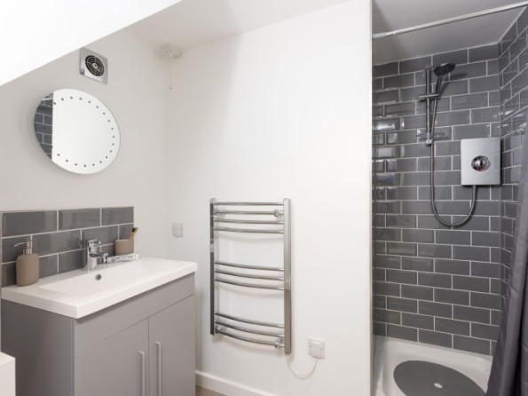 Walk-in cubicle with electric shower, hand basin and vanity unit, WC and heated towel rail