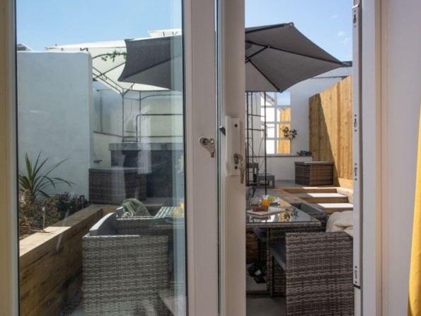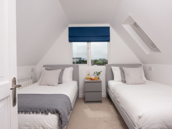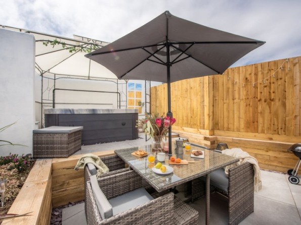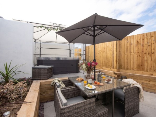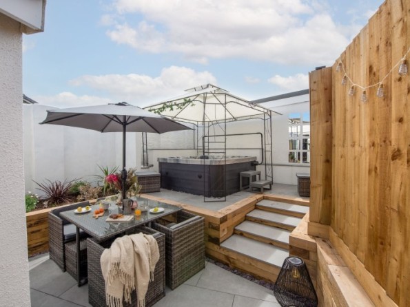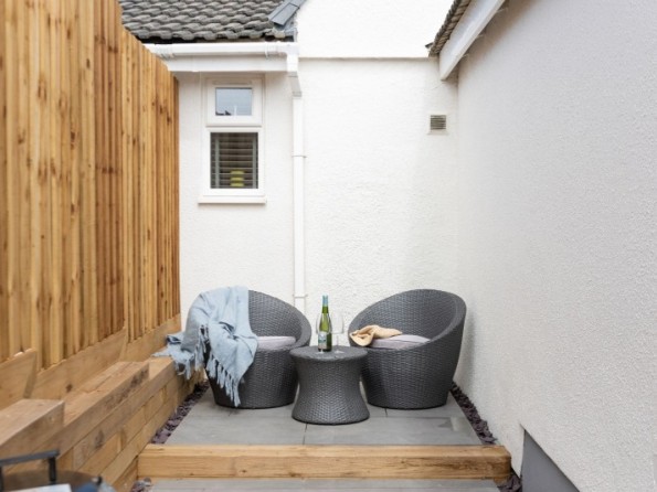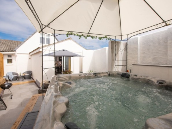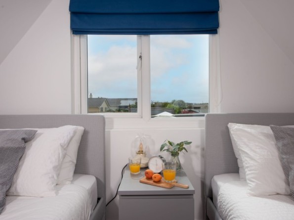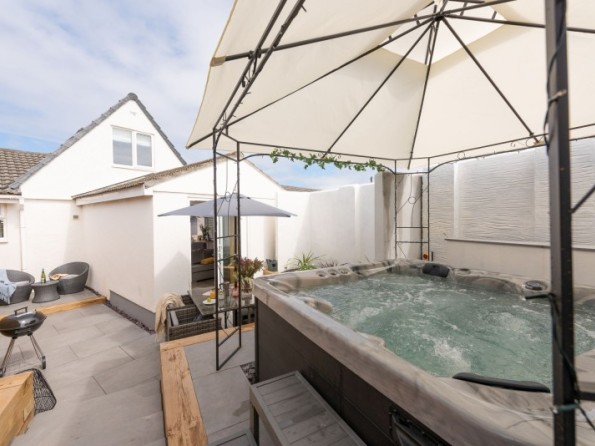 Beautifully furnished and decorated, this gorgeous annexe sleeps four guests with a lovely ground floor open plan living / kitchen / dining area opening out to its spacious private terrace. Here you’ll discover a sun-trap courtyard garden with outdoor furniture which is great for meals or drinks alfresco, as well as a wonderful 6-person hot tub which sits beneath a sunshade; a fantastic way to wind down after a day of exploring. Upstairs there are two stylish bedrooms both of which are bright and airy with comfortable beds. The master bedroom has sea views while the twin room has zip and link beds to provide versatility for families and couples.
