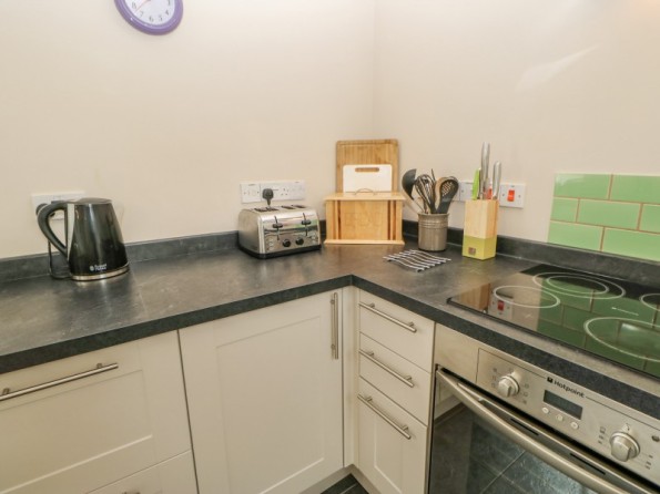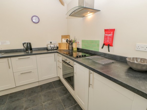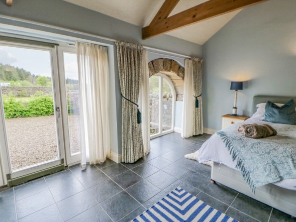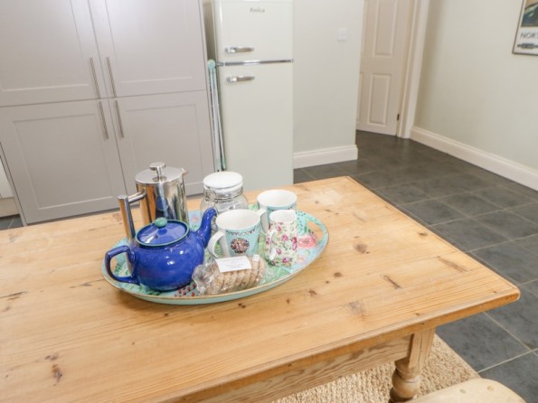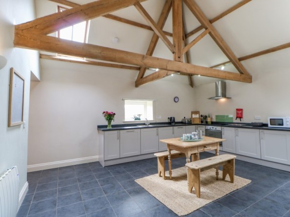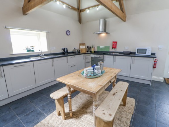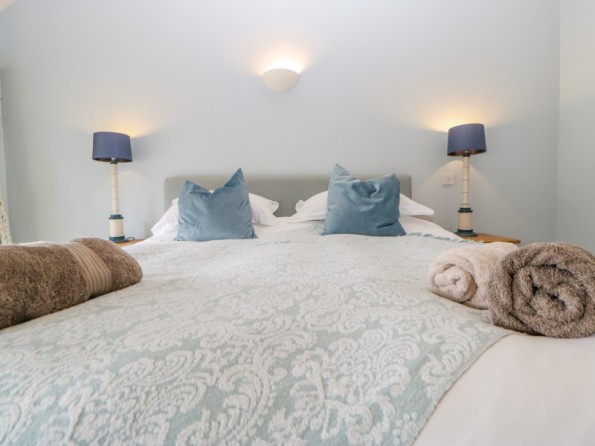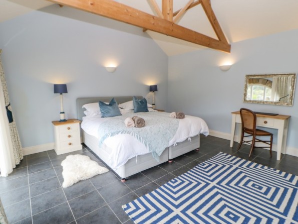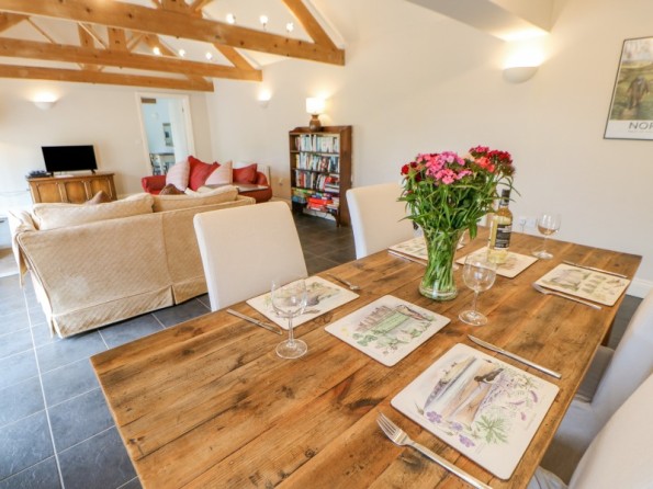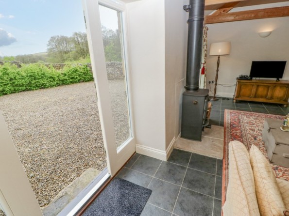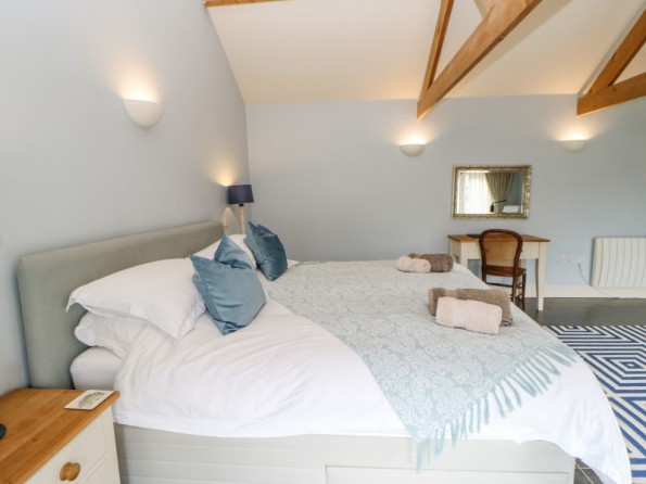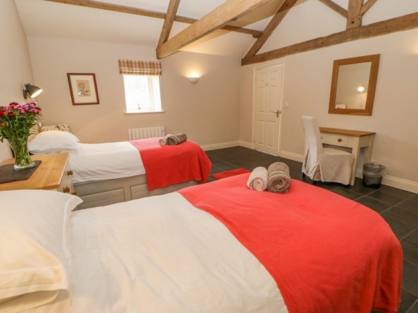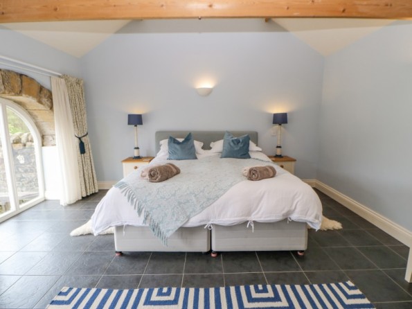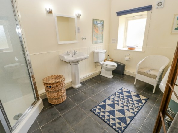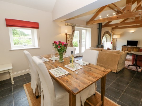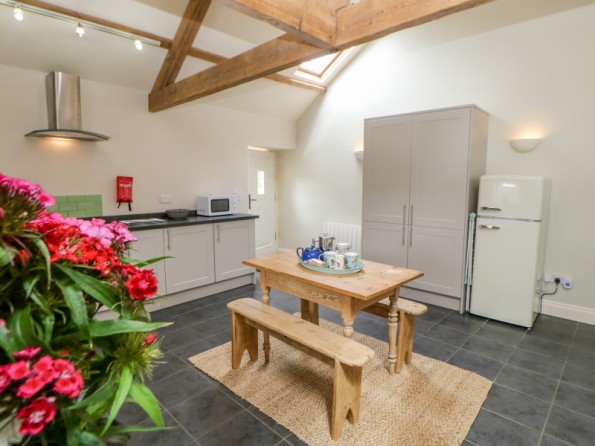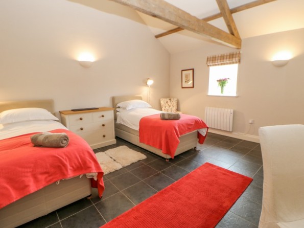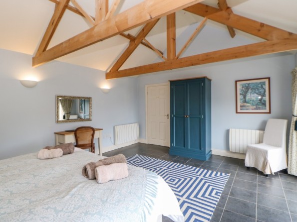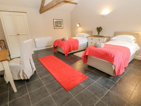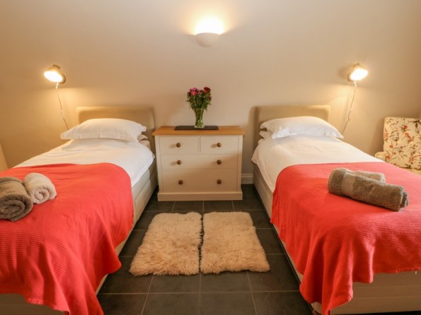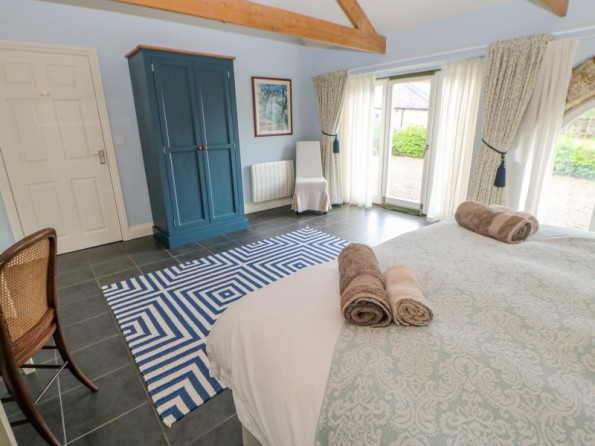 All ground floor. Two bedrooms: 1 x super-king size double, 1 x twin. Bathroom with free standing bath, separate shower, basin and WC. Kitchen with dining area. Sitting room with dining area and woodburning stove.