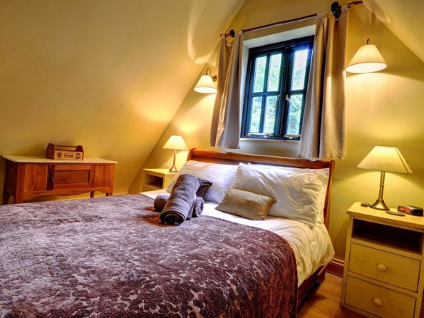 You enter the cottage via a farmhouse-style kitchen with a stable door, an antique table and all the mod cons. This leads through to a living area with a bay window, a log fire, a TV/DVD player and an iPod dock, and on the mezzanine level there is a charming bedroom with a wooden sleigh bed. There is a bathroom with a ‘watering can’ style shower on the ground floor.