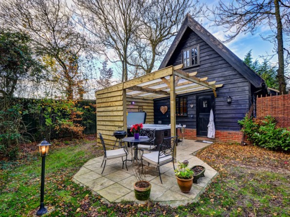 Outside there is a large enclosed garden with a BBQ, dining furniture and a wonderful indoor-outdoor room with a private hot tub. There are other cottages on site, all of which are set within the trees around a pond and a communal decked area.