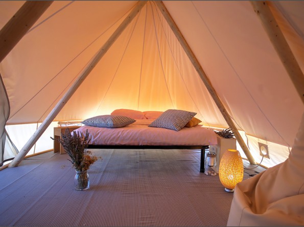 The glamping tents come in three sizes for 1,2 or 3 people, and they are all furnished with double beds, mirrors, lights and storage. The communal bathrooms nearby are beautifully decorated and very well equipped.