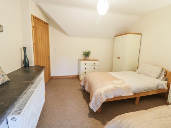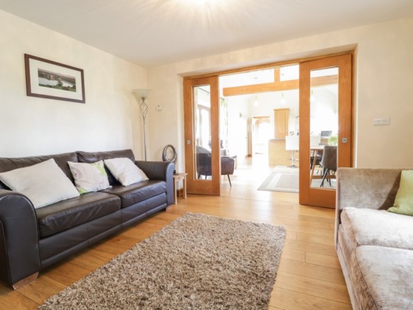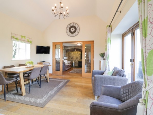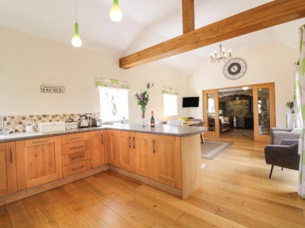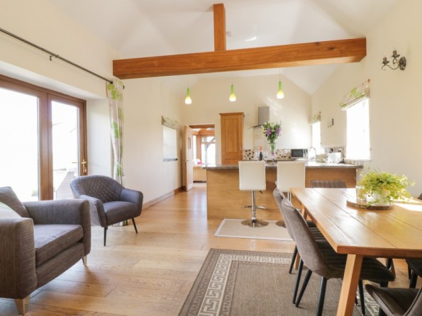 Three bedrooms: 1 x ground floor King Size, 1 x double with TV, 1 x twin. Ground floor shower room with wet room-style shower, basin and WC. Bathroom with bath, hand-held shower, basin and WC. Kitchen with breakfast bar (seats 2), dining area, comfy seating for 3 in the kitchen and Bi-fold doors to patio. Sitting room (seats 6) with woodburning stove. Conservatory (seats 6). There are robes for use when coming out of the hot tub as well as extra towels for the hot tub. There are no beach towels, as these are to be used for hot tub only.