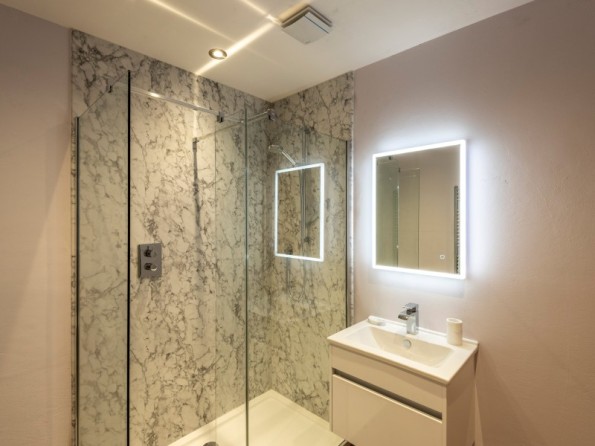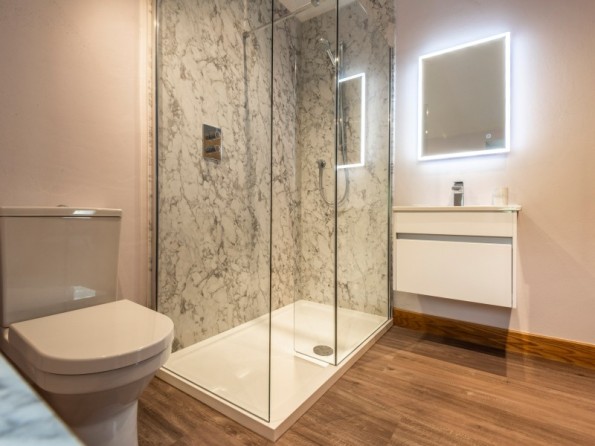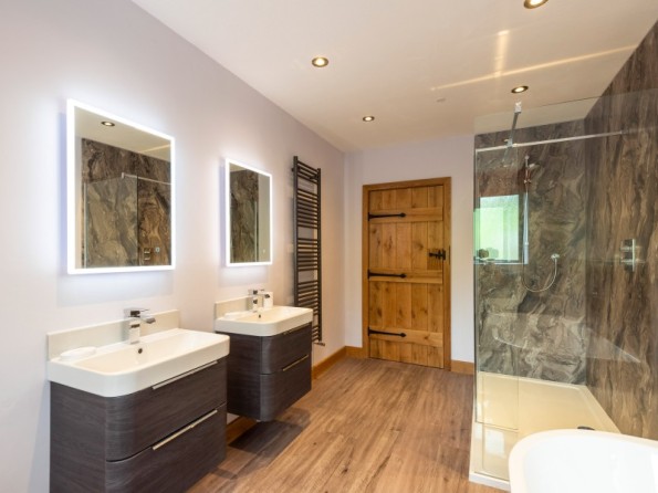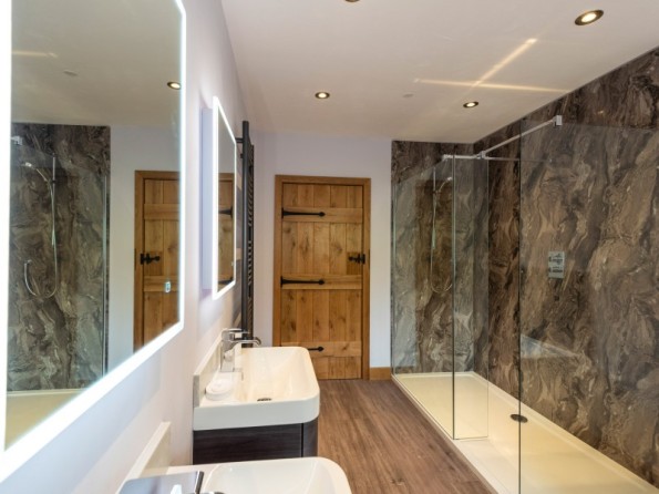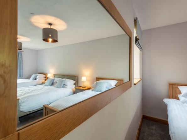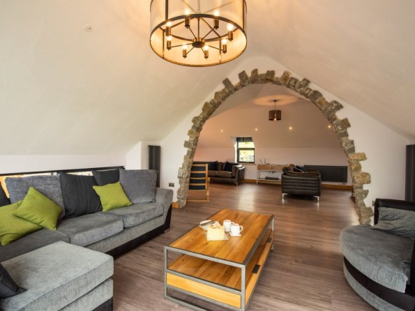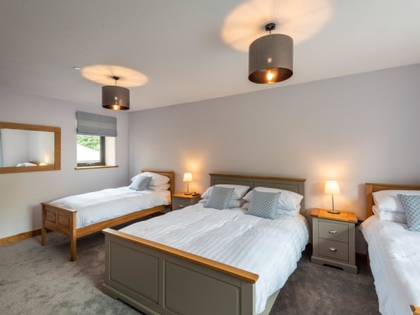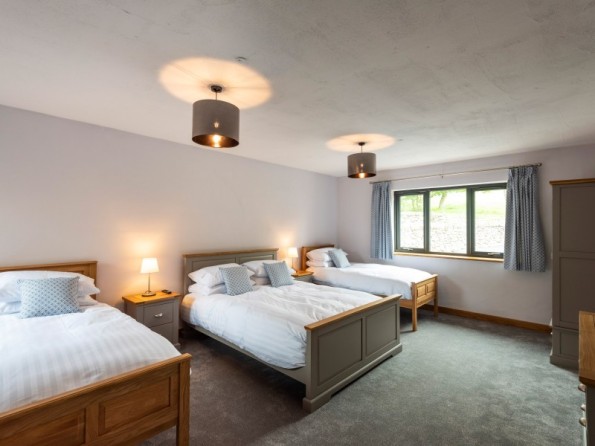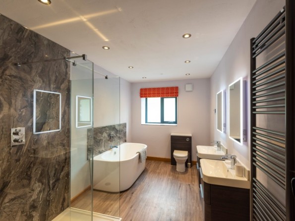 Five bedrooms: 1 x ground-floor family bedroom with king-size bed and two single beds, 2 x king-size bedroom with en-suite walk-in shower, basin and WC, 1 x ground-floor king-size bedroom with en-suite wet room walk-in shower, basin and WC, 1 x ground-floor king-size bedroom. Ground-floor bathroom with walk-in shower, separate bath, basin and WC. Cloakroom with basin and WC. Open-plan living room with kitchen, dining area and sitting area. Utility. First-floor sitting room