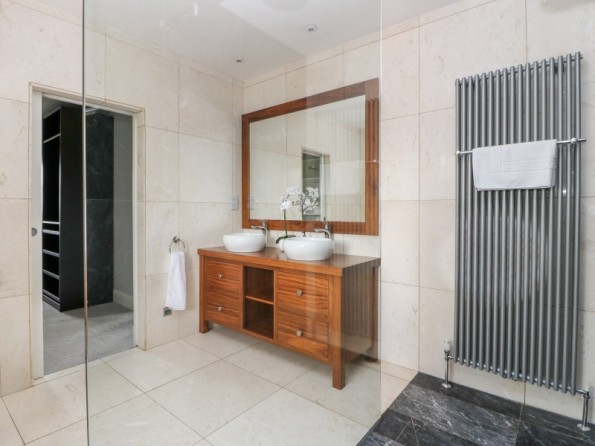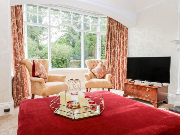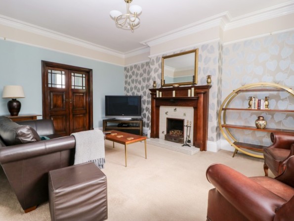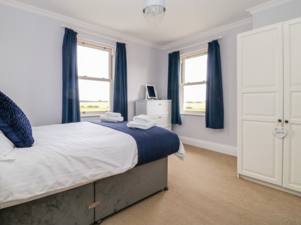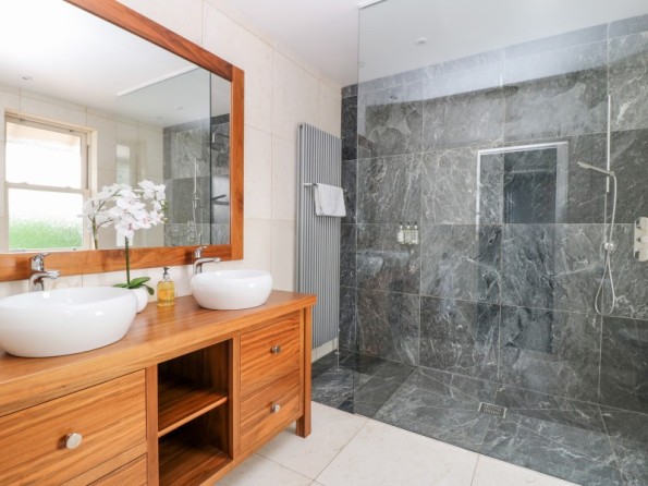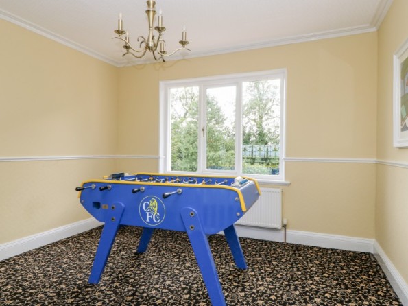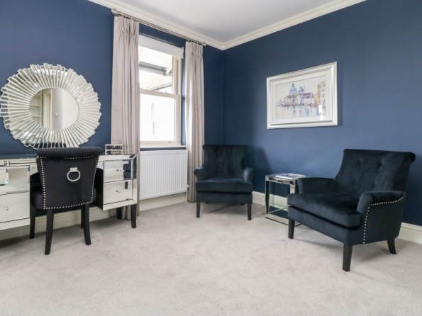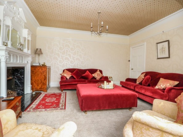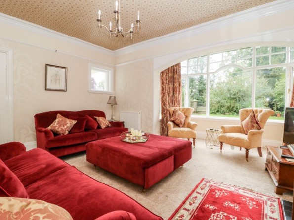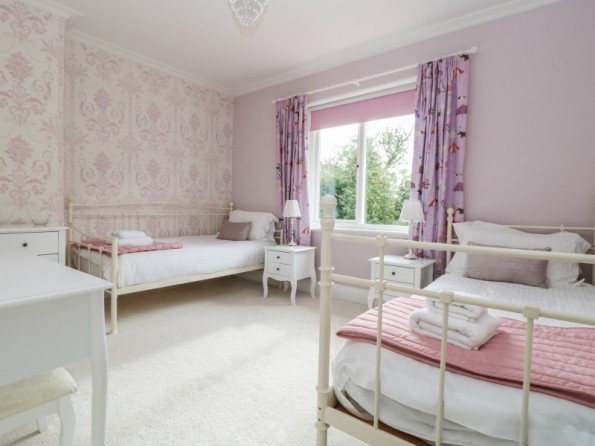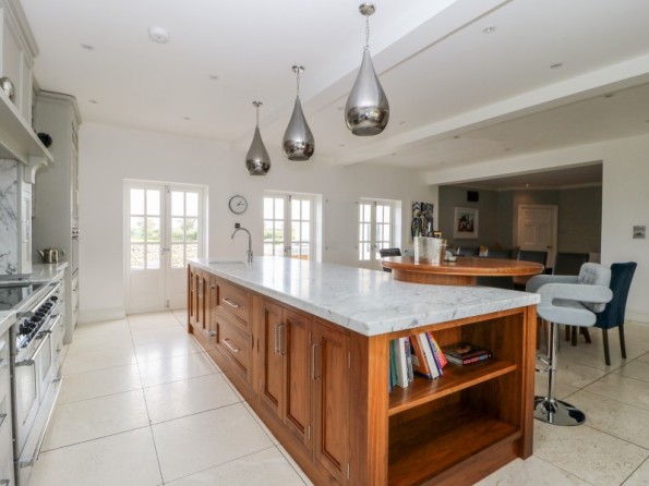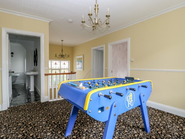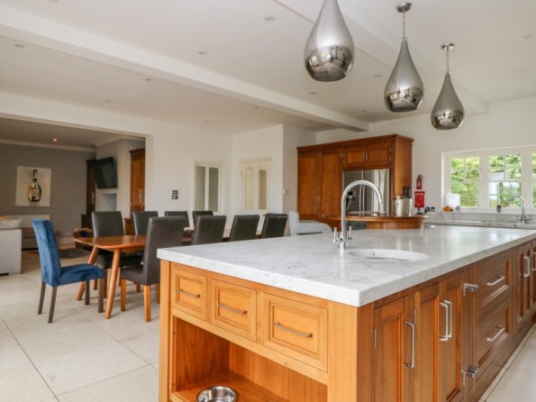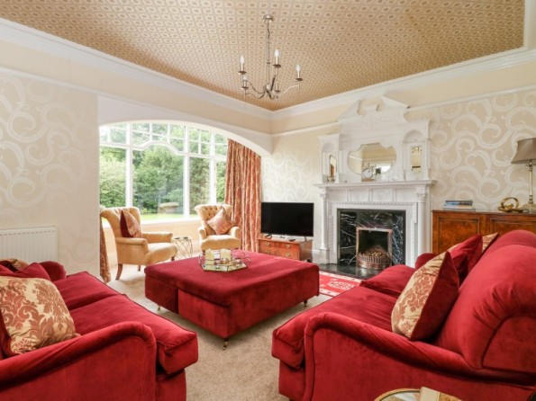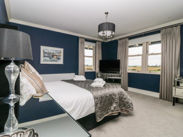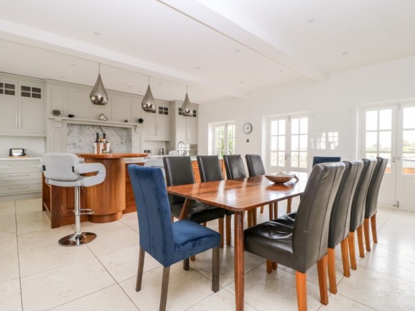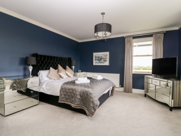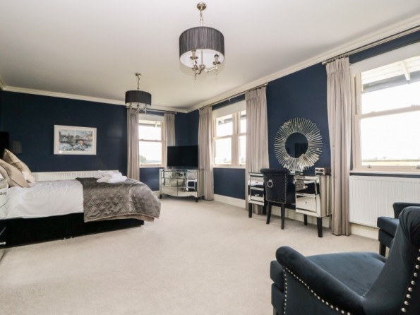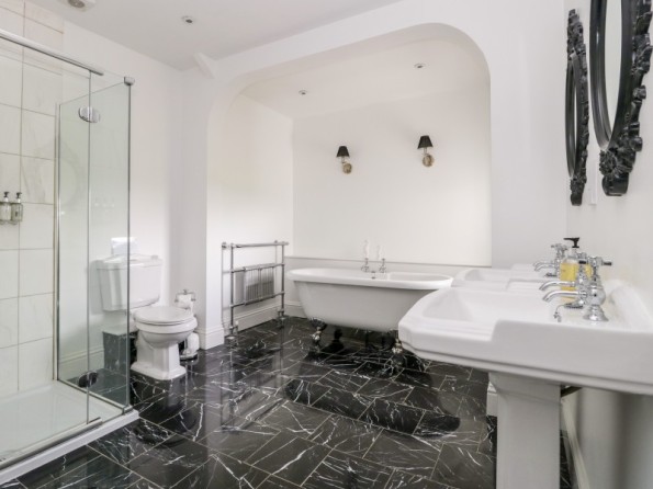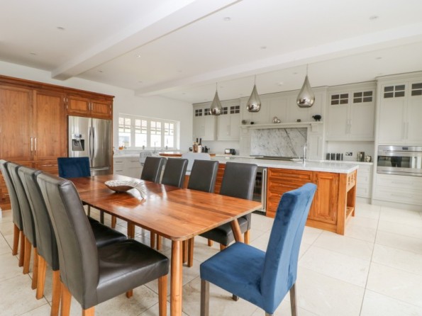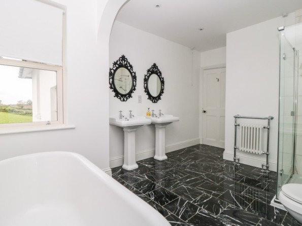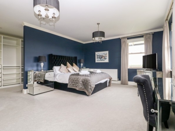 Five bedrooms: 1 x king-size with TV and walk-in wardrobe with en-suite wet room shower, 2 x basin and WC, 1 x king-size with TV with en-suite shower, basin and WC, 1 x king-size, 1 x double and 1 x twin. Bathroom with bath, separate shower, 2 x basin and WC. Cloakroom with basin and WC. Open-plan living space with kitchen, dining area and sitting area with woodburning stove. 2 x sitting room with open fire. Study