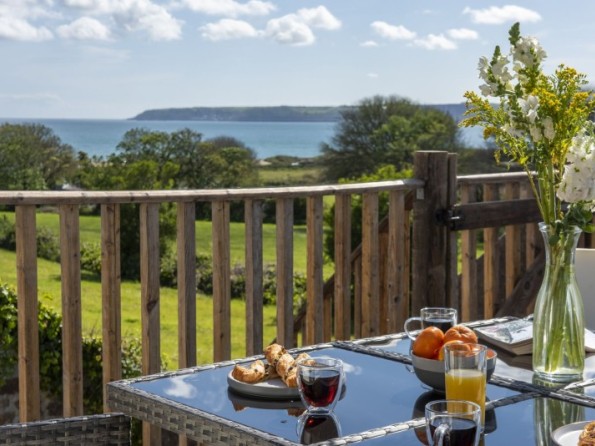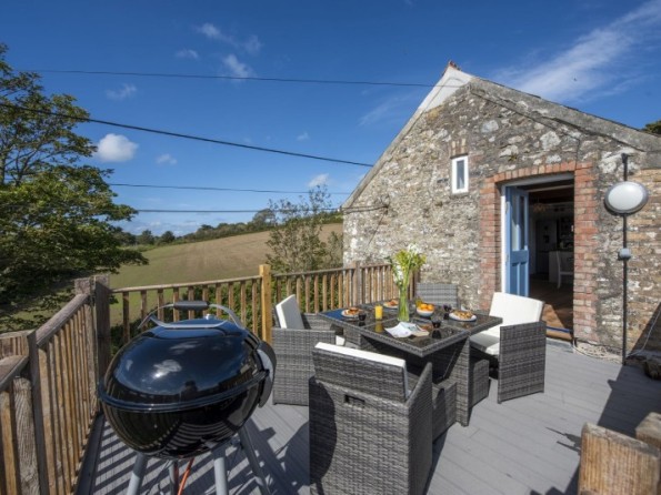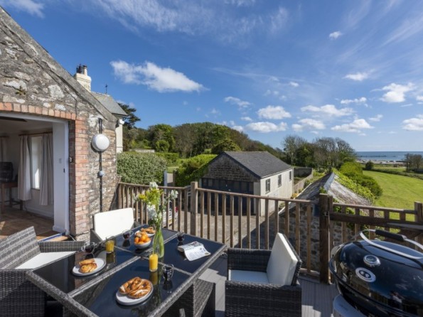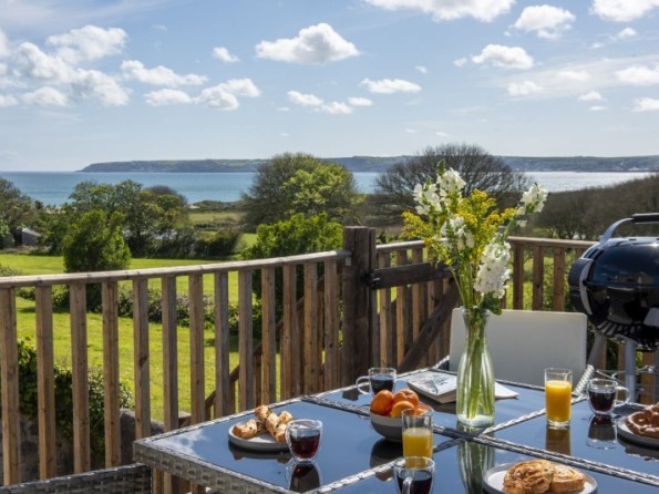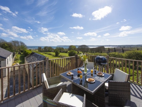 Private decked balcony with table, four chairs and four stools, gas BBQ and views across Mounts Bay