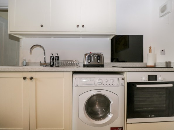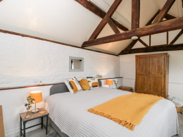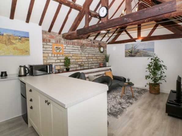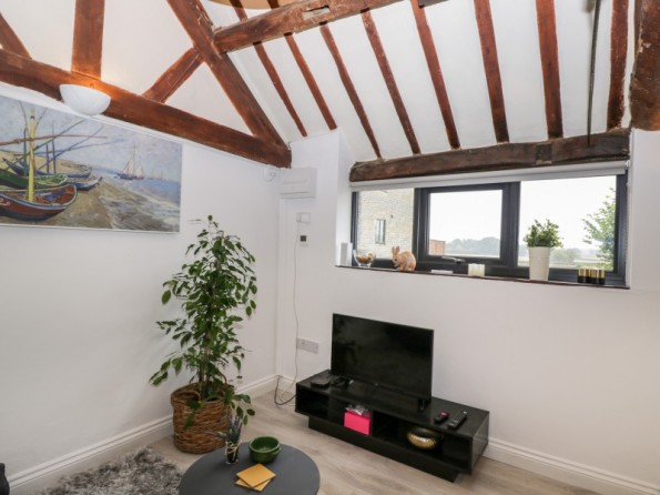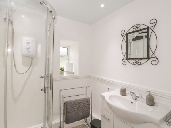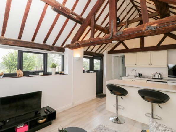 All-ground-floor. One super-king-size bedroom. Shower room with walk-in shower, basin, heated towel rail and WC. Open-plan living space with kitchen, dining area and sitting area