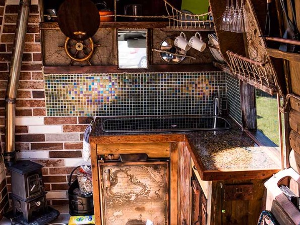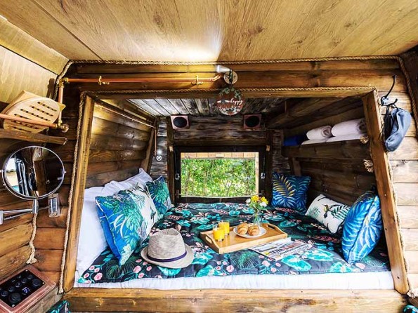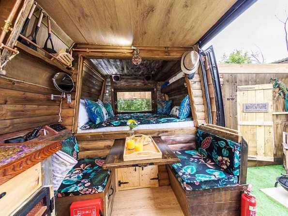 Inside Gulliver a comfy bed for two, a wood burning stove, and a variety of mod cons including a fridge and gas hob. All you need for a cosy romantic break.