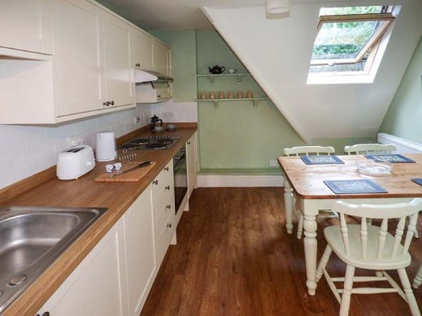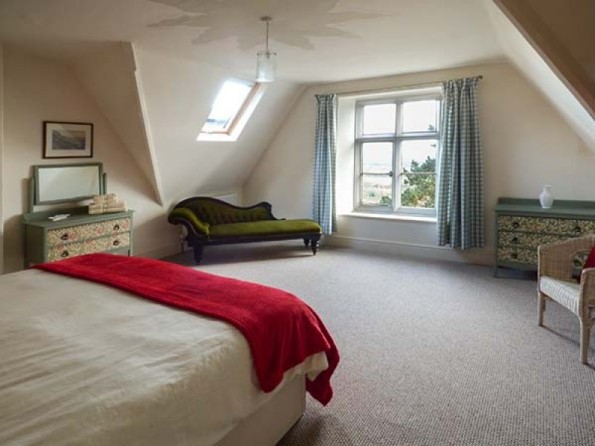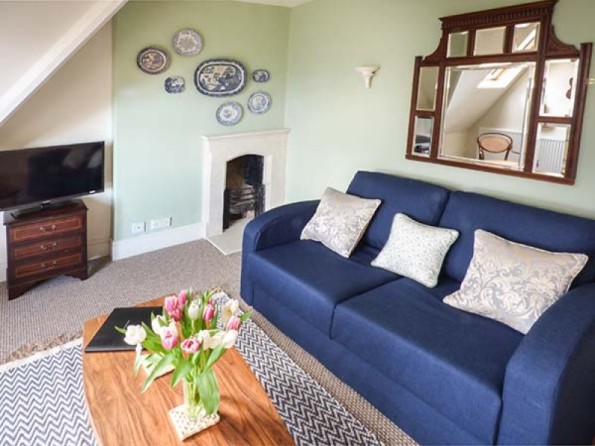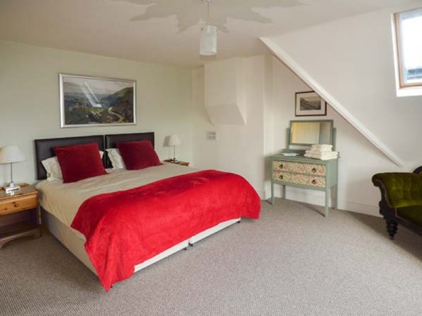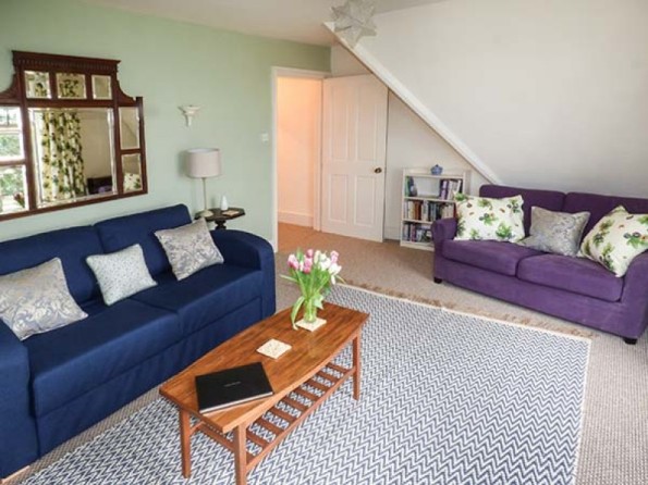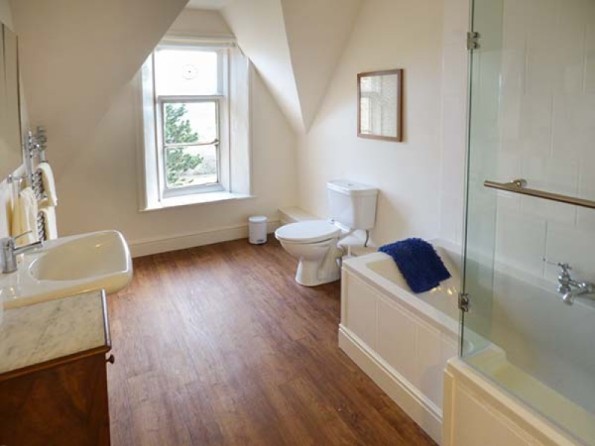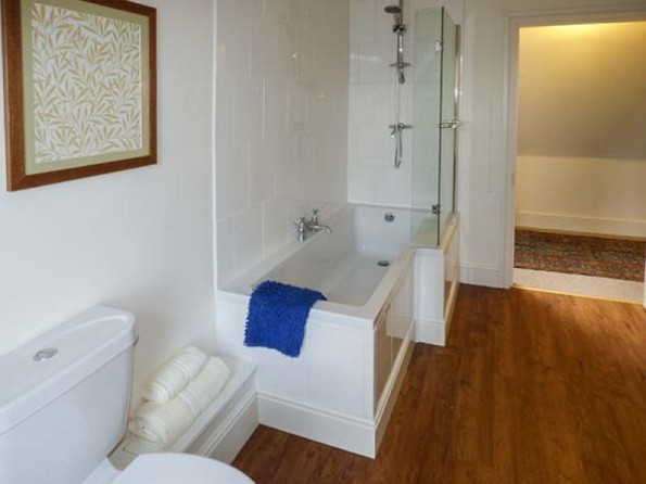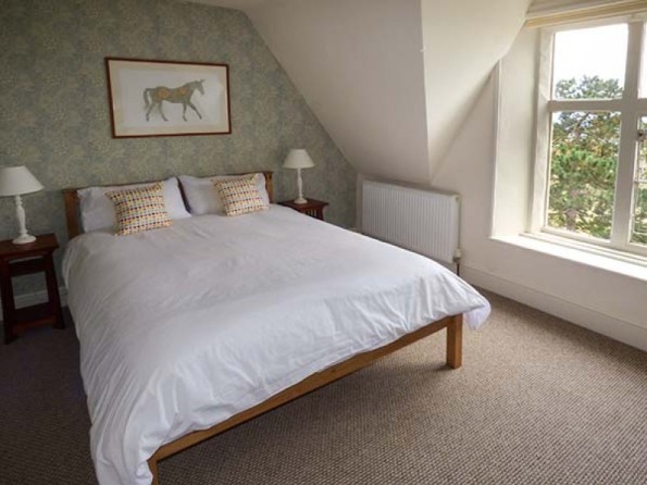 All top floor. Two bedrooms: 1 x super king-size double (zip/link, can be twin on request), 1 x king-size double. Bathroom with bath, shower over, basin and WC. Kitchen with dining area. Sitting room.