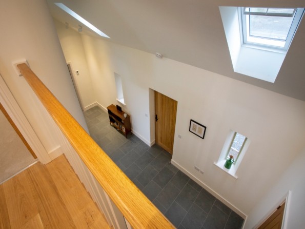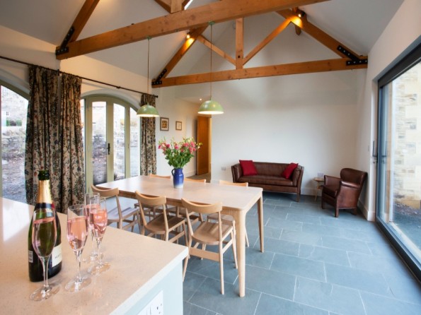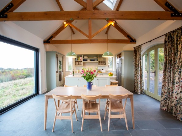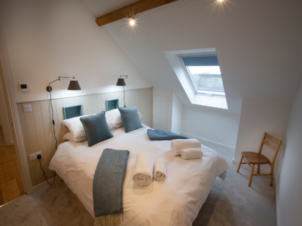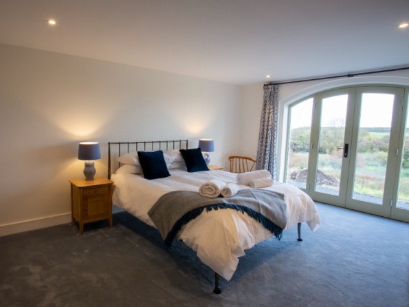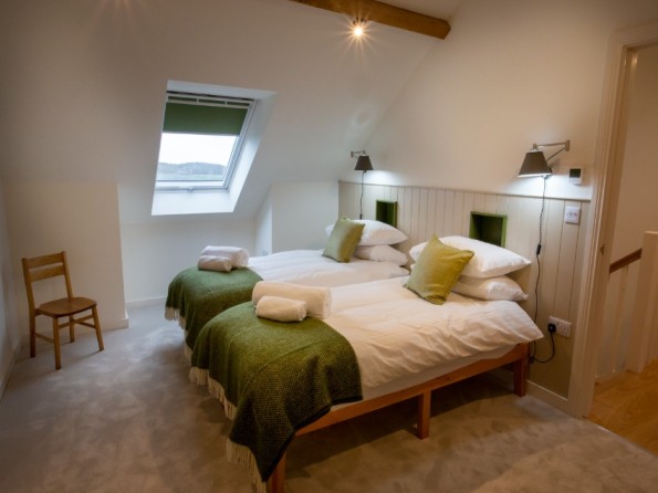 The house is newly built in a traditional style using local craftsmen and materials - its slate floors, exposed beams and picture windows all combine to give off an eco chic vibe. It sleeps six guests in three bedrooms - two kings and a twin (plus an additional child’s bed available in the study). All three bedrooms have en suite shower rooms, and there’s an additional cloakroom / toilet. The main bedroom is on the ground floor, making it ideal for those with reduced mobility. There is a vaulted entrance hall which leads to the spacious and open plan kitchen / dining / sitting room which has exposed beams and full length picture windows on two sides. There’s a second sitting room, also with a picture window and with a log burner, and a separate study room beyond (which can accommodate an extra child if required). The kitchen is very modern and includes all the mod cons, crockery and utensils you might need, as well as a boiling water tap, ice dispenser and dishwasher, and there is a washing machine and dryer in the utility room. The sitting room has a Smart TV. The heating is all thermostatically controlled using an eco friendly air source heat pump system and there is wifi throughout.