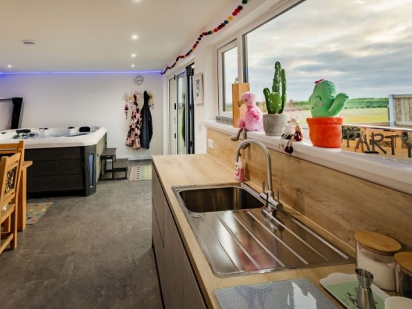 Found within the ‘hot tub house’ the kitchenette has its own small fridge, sink, kettle and Tassimo coffee machine. There is also a well-stocked gin bar (honest box in place)