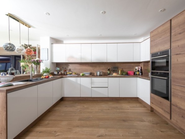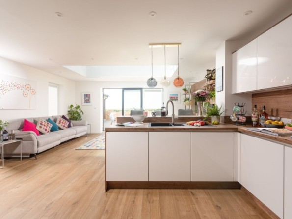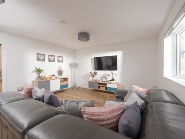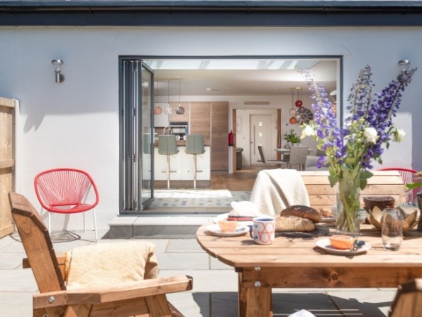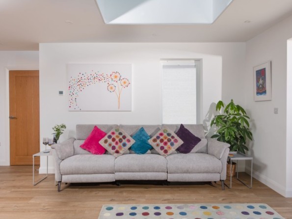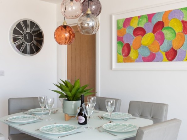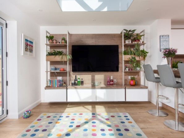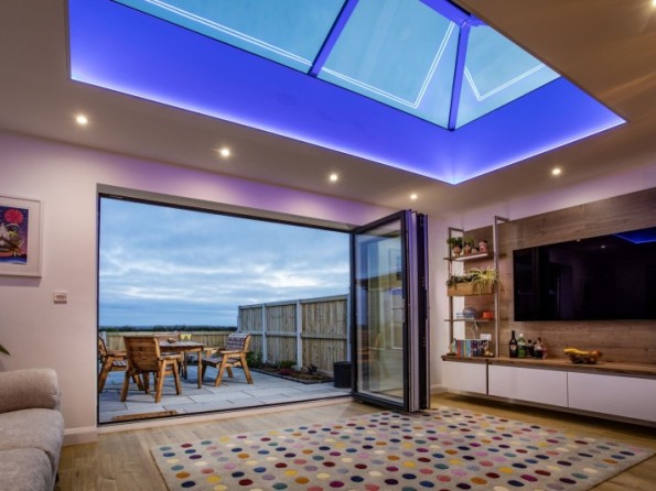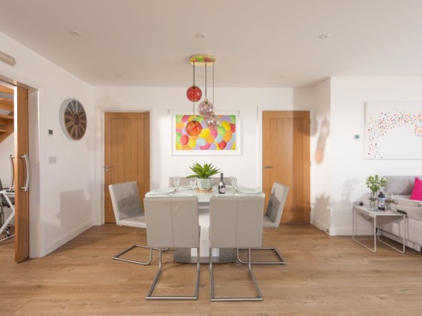 Open plan with the kitchen and dining area this fantastic room leads right out to the deck through bi-fold doors and has a wonderful glass skylight overhead. The sitting area is furnished with a three-seater sofa, large flat screen Smart TV and a bespoke shelving unit with plants, books and ornaments, as well as bold, contemporary wall art which adds colour to the room. LED lights add a magical ambience at night-time