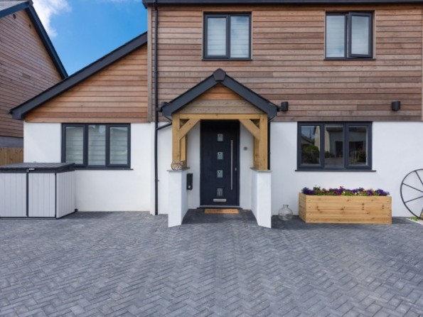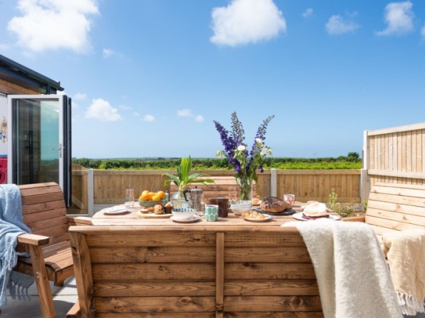 An amazing suntrap decked terrace to the front of the house features incredible panoramic views over the countryside and across Mounts Bay. Furnished with a large wooden table and chairs and sun loungers