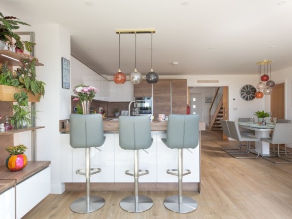 Open plan with the dining /sitting area, the kitchen features a breakfast bar with three chairs. Its range of large and small appliances include an induction hob, electric single fan-assisted oven, fridge, freezer, dishwasher, cafetiere and microwave. A Quooker tap provides boiling water.