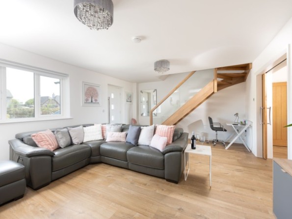 On entering the home, guests will be welcomed into the spacious, light-filled ground floor sitting room which features a large corner sofa with the two end seats reclining electrically. The room is furnished with a TV cabinet and Smart flat screen TV as well as a sideboard with radio. The sliding door can be used to either separate this room from the main living area, or open it up into one enormous, convivial space. There is a small office space with a desk and chair under the stairs.