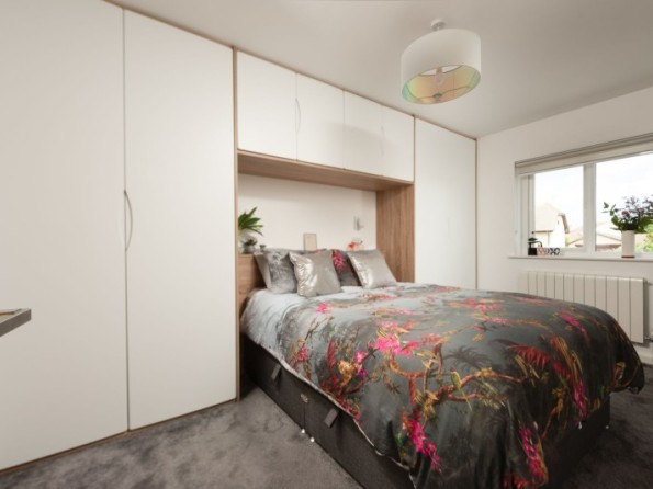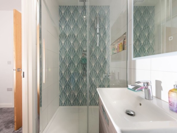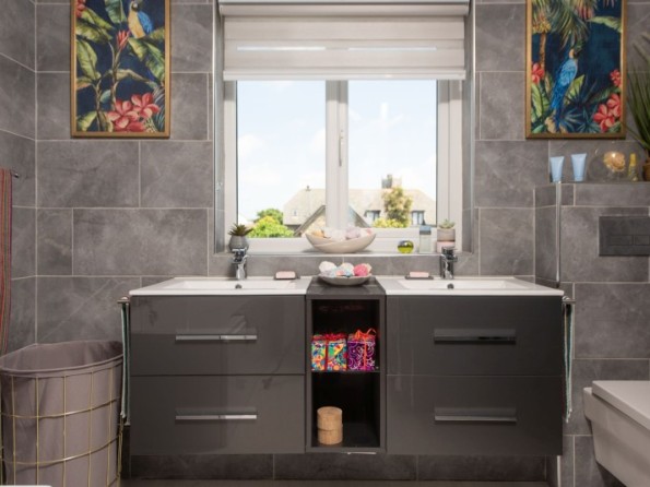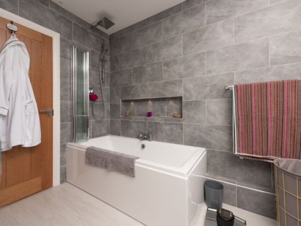 Located on the first floor, the contemporary family bathroom has a bath with shower over, his and hers basins, heated towel rail, electric de-mister mirror, hairdryer, shaver point, cabinet and WC
