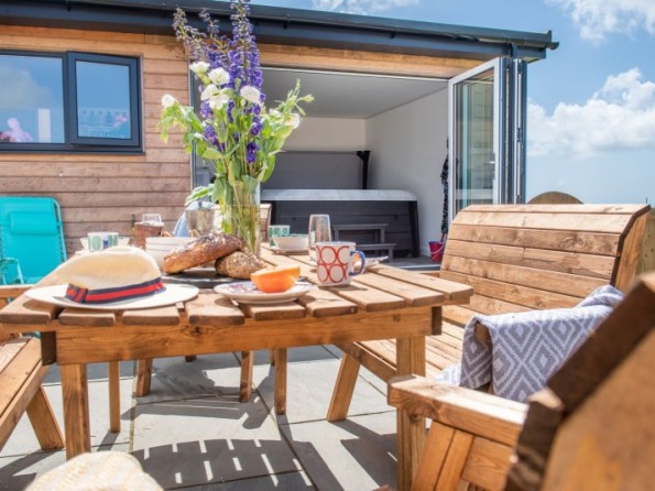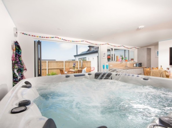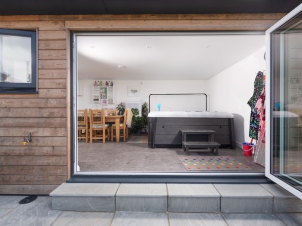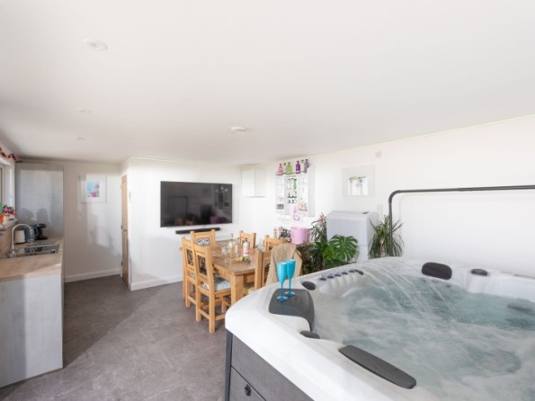 The Summer House which looks like an extension of the house and which also opens up with bi-fold doors on to the deck, houses a large 5 person electric hot tub, kitchenette, dining area, TV and shower room.