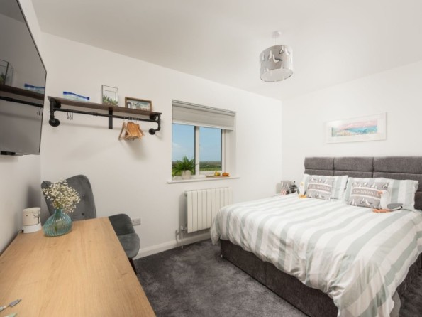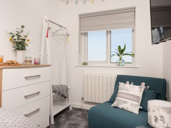 This bedroom is situated on the first floor and has amazing sea and countryside views (on a clear day you'll be able to see all the way out to the Isles of Scilly). Furnished with a king size bed, an armchair, bedside tables and lights, a chest of drawers, mirror, shoe and clothes storage and Smart flat screen TV