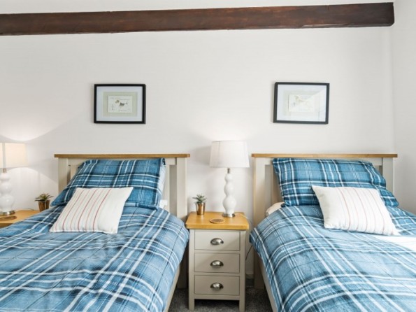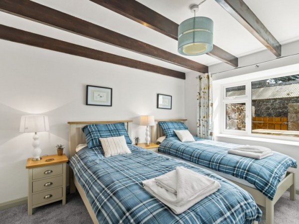 Arranged over two floors, the Horseshoe Cottage is ideally suited to couples and families, with the ground floor bedrooms comprising a master bedroom with king size bed as well as a second twin room and a family shower room. Overhead timber rafters lend an authentic rural charm to the rooms which are both elegantly furnished in a modern country style, and have large windows framing the lovely views of the enclosed garden space.
