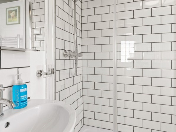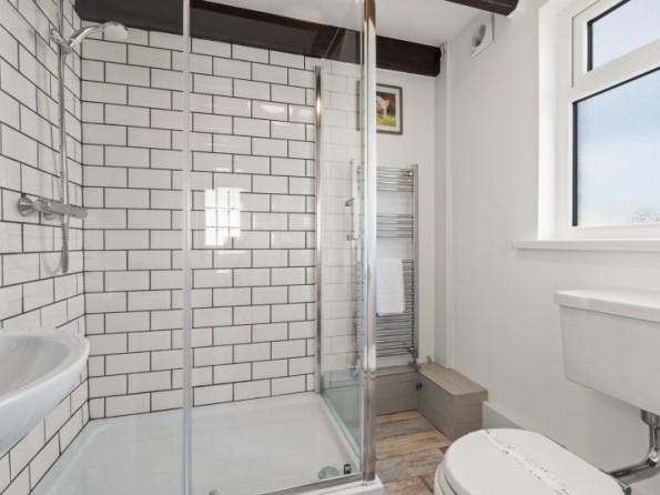 Large walk-in shower cubicle, hand basin, heated towel rail and WC