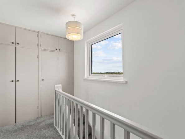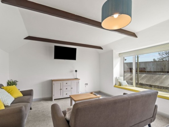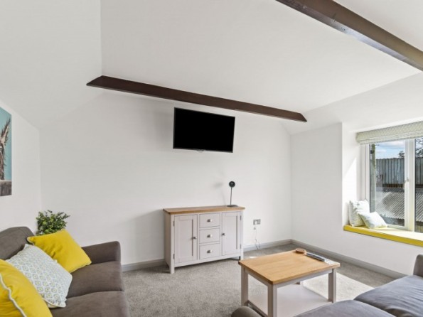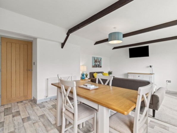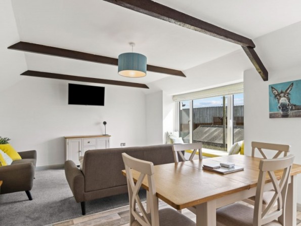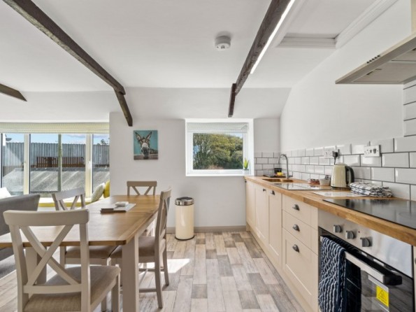 Upstairs there’s an inviting open plan living area with lovely views over the surrounding landscape, where two stylish sofas and a cosy window seat make it the perfect place to enjoy afternoons of relaxation. A well-equipped kitchen makes whipping up delicious home-cooked meals a breeze, and the cleverly laid out dining space means evenings can be spent socializing and spending time together.