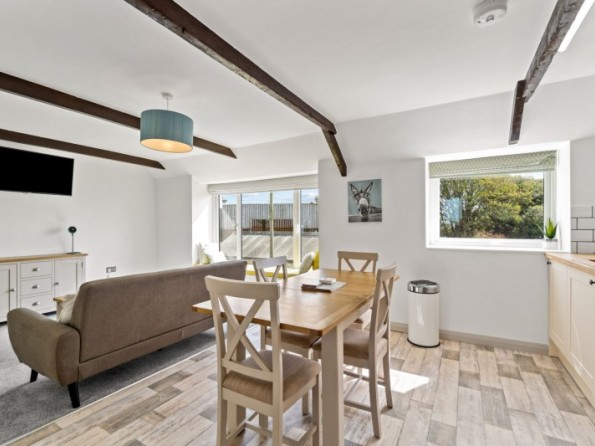 Open plan with the kitchen and living areas, with a table and chairs seating four