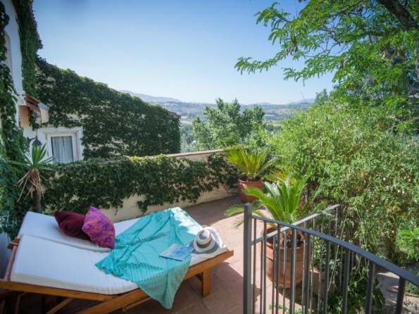 There are six different types of room available, all of which have ensuite bathrooms and private terraces. The standard double room is north west facing and have quiet views over the olive grove. The superior double room faces the olive grove and has a separate living area with open fire. There is a junior suite with sitting area, open fire, and large terrace overlooking the gardens and pool. The classic suites have views over the gardens and the deluxe suites have both a shower and copper bathtub, and long ranging garden and valley views. There is a duplex suite to sleep up to four people in two bedrooms. The tower bedrooms is accessed via a spiral staircase and this suite has spectacular views over the Sierra de las Nieves. Extra beds are available for children. Wi-Fi is available in all areas and is free of charge.