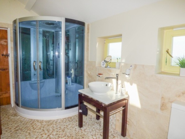 Two bedrooms: 1 x king-size double, 1 x twin. Shower room with shower , basin and WC. Open plan living area with kitchen, dining area and sitting area with woodburning stove. Study. Utility.