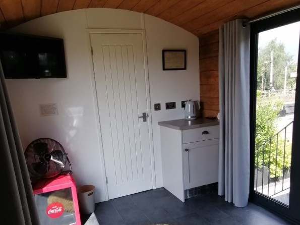 The van has a double bed with a single bunk above it, sleeping up to 3 people in total. It also has an en-suite shower room with WC, a kettle and fridge, a TV and heating for the winter months.