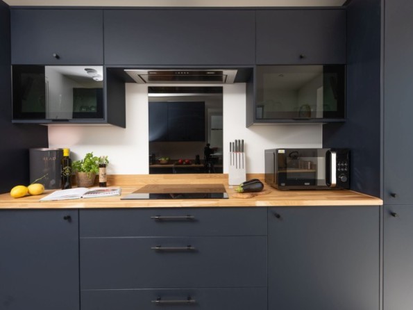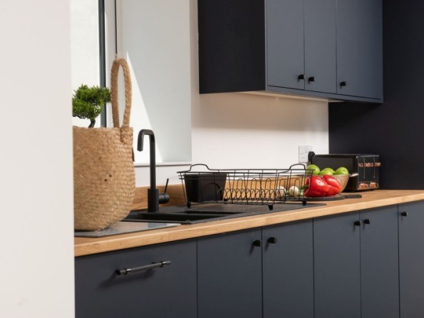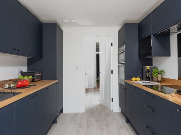 The contemporary kitchen features a range of large and small appliances which include an induction hob, electric single fan-assisted oven and grill, fridge / freezer, dishwasher, cafetiere, kettle, toaster and microwave. A selection of glasses, cutlery, crockery, cookware and utensils is provided