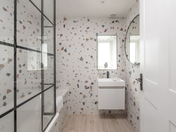 Located on the first floor, the family bathroom includes a bath tub with shower over, wash basin, WC, heated towel rail, mirror and cabinet