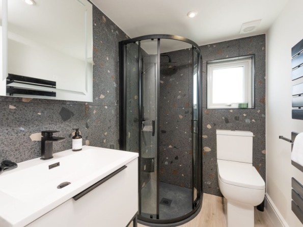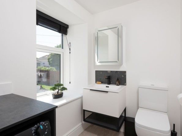 Located on the first floor this bathroom is the en-suite to the master bedroom and has a walk-in shower, a hand basin, mirror, cabinet, heated towel rail and WC