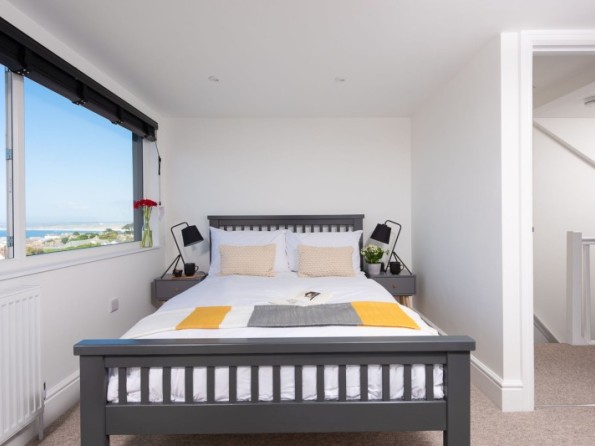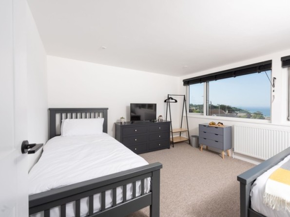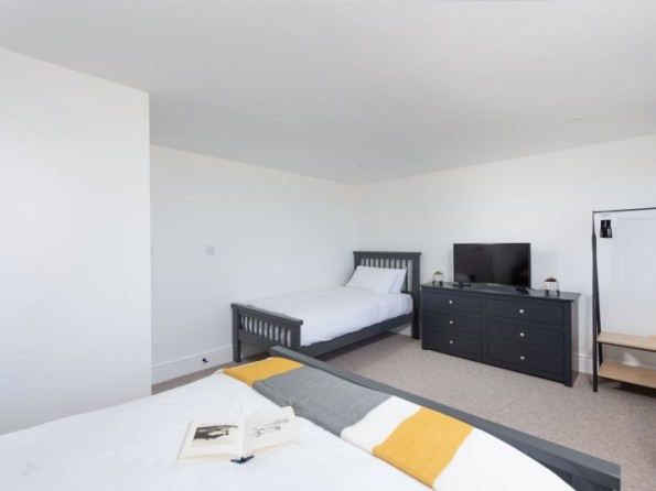 This front-facing second floor bedroom has lovely sea views and makes an excellent room for families with young children as it is furnished with a double bed and as well as a single, and a smart TV. Other items include an alarm clock, bedside lamps, bedside tables (with hairdryer), a free-standing wardrobe and chest of drawers