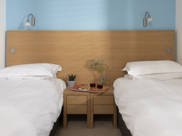 Twin room with built in wardrobe, side tables, reading lights and chair