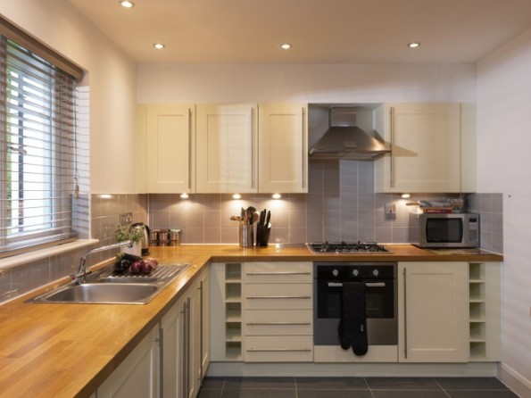 Wood worktop with microwave, kettle, toaster, gas ring hob and oven