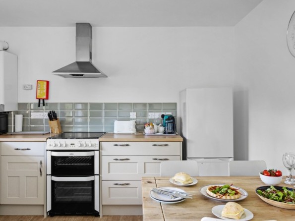 Double gas oven with gas hob, microwave, fridge freezer and dishwasher