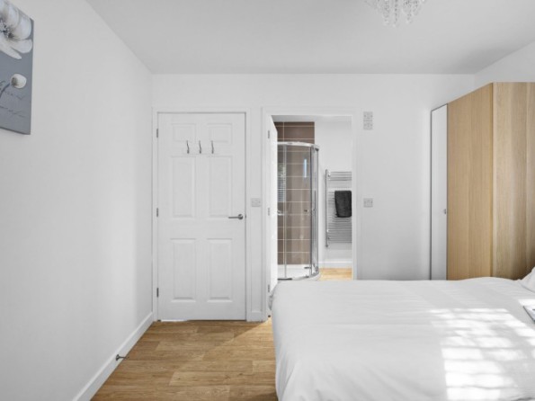 The master bedroom en suite has a walk in shower cubicle, WC and wash basin