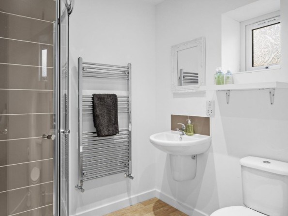 Bedroom two has a walk in shower cubicle, WC and wash basin
