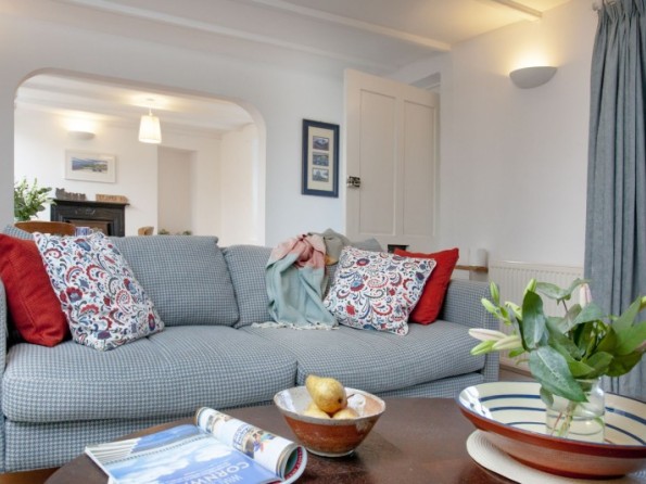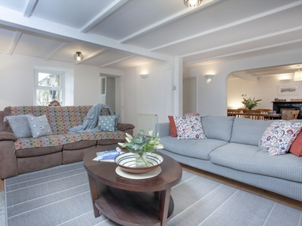 Bright and welcoming the living room is open plan with the dining area and is furnished with two roomy sofas, a coffee table and TV stand with Smart flat screen TV. This room accesses the private garden through French doors