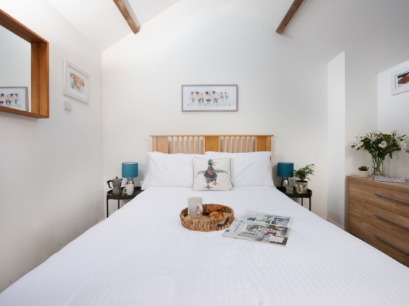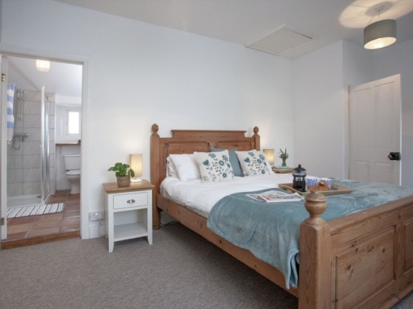 Located upstairs on the first floor this gorgeous en-suite bedroom is furnished with a double bed, chest of drawers, bedside tables with lamps, a mirror and a built-in wardrobe. A window bench under the sash window makes a lovely spot for enjoying a morning coffee