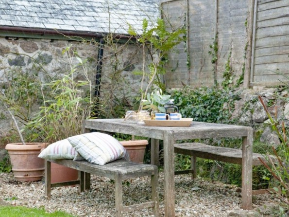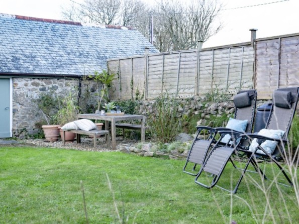 An enclosed garden with mature plants and lawn, and a gravel area with an outdoor table and benches. The garden is private and secure and perfect for guests with children. Two sun loungers are ideal for relaxing in the sunshine.