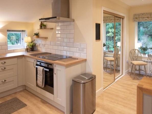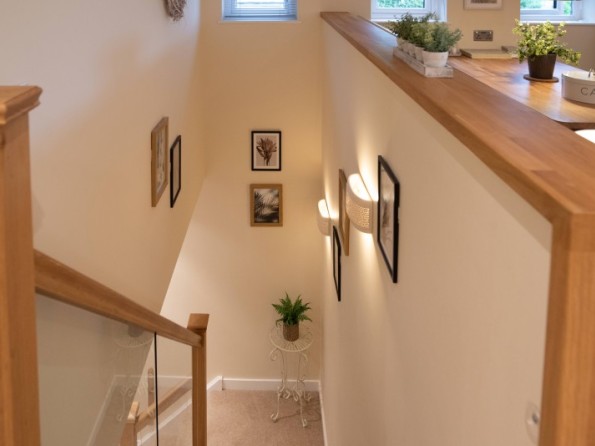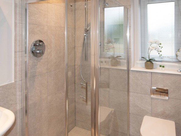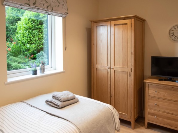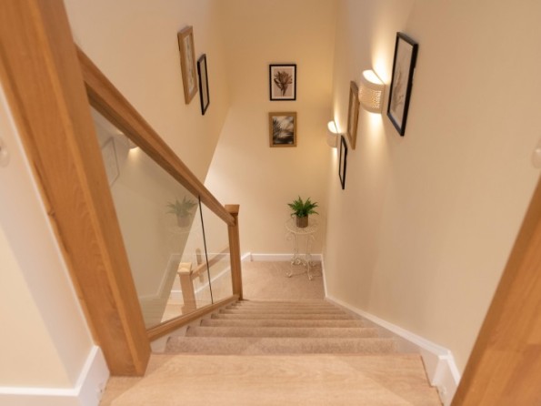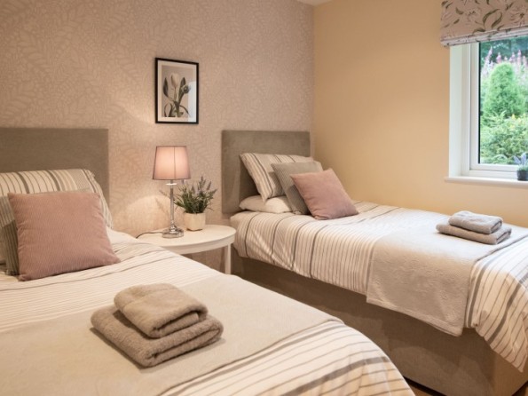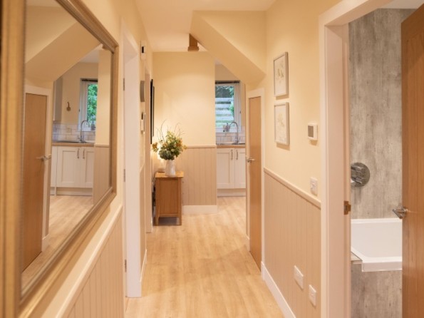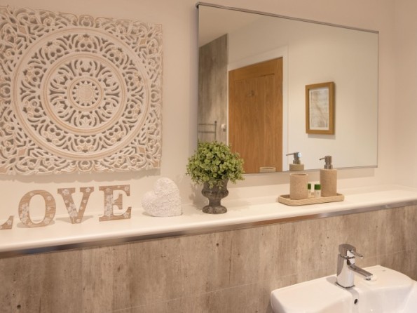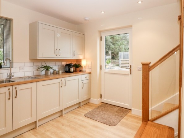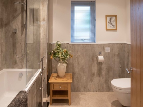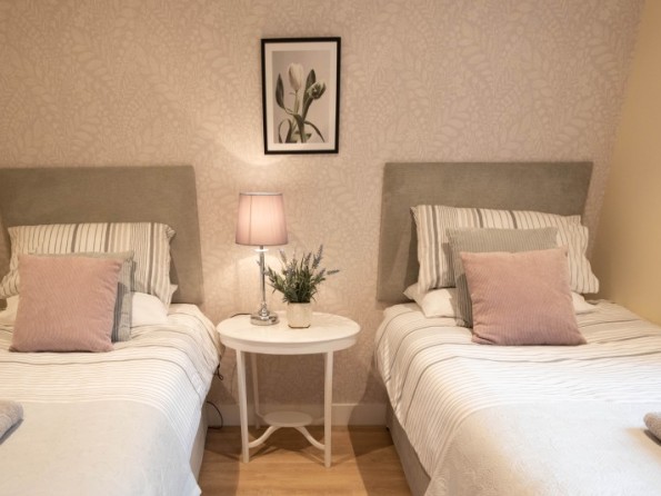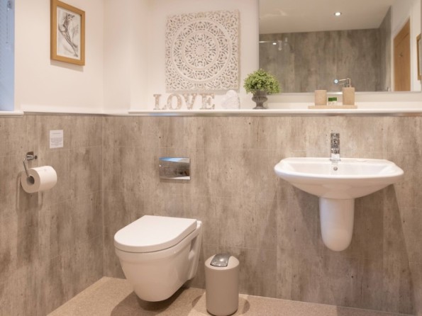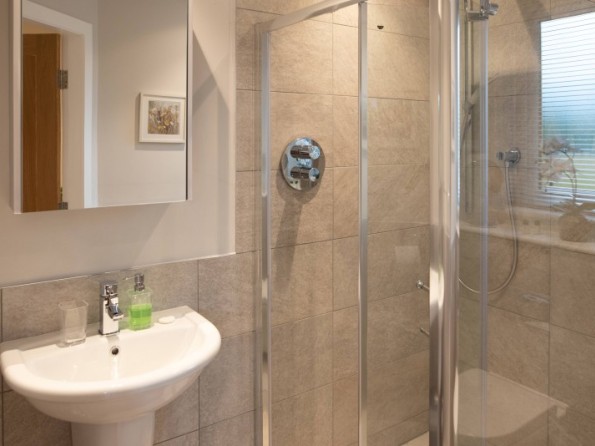 Reverse-level accommodation. Three bedrooms: 1 x ground-floor king-size with en-suite shower, basin and WC, 1 x ground-floor double, 1 x ground-floor twin. Ground-floor bathroom with bath, overhead shower, basin and WC. First-floor open-plan living space with kitchen, dining area and sitting area, opening onto a balcony. Utility. First-floor cloakroom