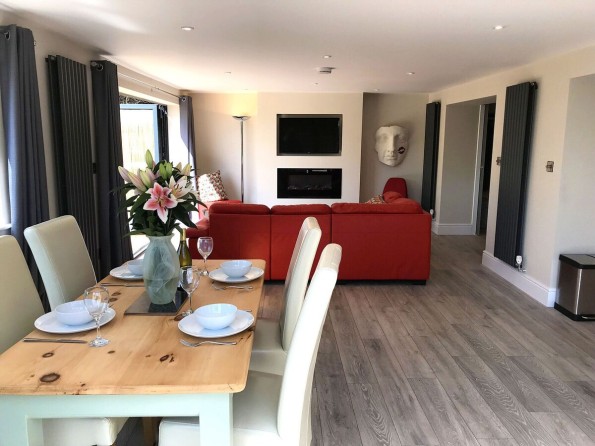 All on ground floor, with large open plan living room and kitchen, dining area and 1 spacious bedroom with king-size bed and good size walk in shower room with underfloor heating.